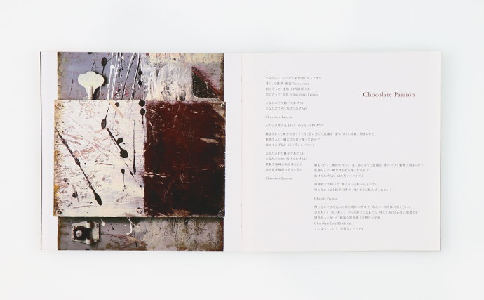 今迄で最も頁数が多い28頁におよぶブックレットを捲ると、一見するだけでは分からないがピックアップやコイル、ボリュームつまみ、ペグやアンプのスピーカー部等々、ギターパーツがアートと化している。盤面は銀抜きにしているタイトル以外、すべてホワイト・オン・ホワイト。情報を見せることが目的でないのは一目瞭然。それより大切なのは、アートワークの世界観、更には楽曲の世界観をいかに壊さず存在出来るかだろう。 歌詞の級数は小さく整然と配置され、空間に生まれし余白は静寂ながら想像力を掻き立てられる。